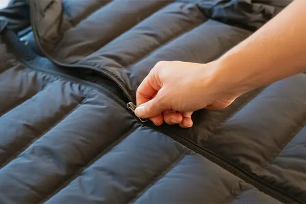 Loose items in pockets are a common cause of jacket damage. A single sharp object can puncture the insulation chambers. Remove all tissues, keys, and lip balms, then zip the jacket all the way up.